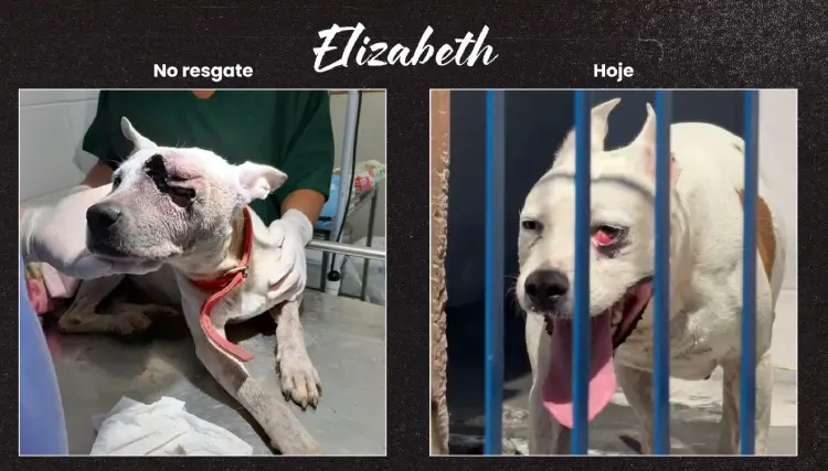 Elizabeth, uma pitbull branca, foi resgatada com ferida exposta abaixo do olho causada por larvas. Após tratamento adequado, a cicatrização evoluiu e as sequelas se tornaram mínimas.